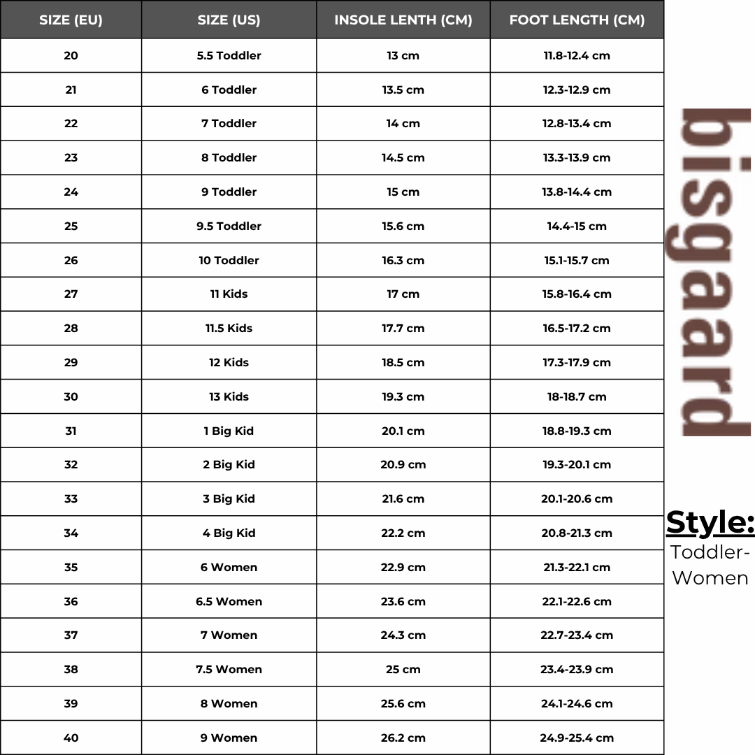 Bisgaard's Sizing Notes: Add 1 cm to length of your child's foot to determine the best size, if your child is still growing. The size chart indicates the inner length and the inner width of the shoes in centimeters.
