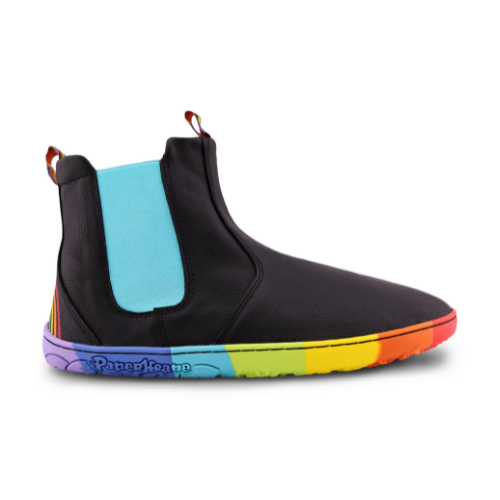 🌈 Make every step shine! Introducing the JewelChic Chelsea Boots – bold rainbow soles, colorful elastic sides, and barefoot freedom all wrapped in premium leather.